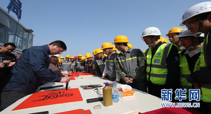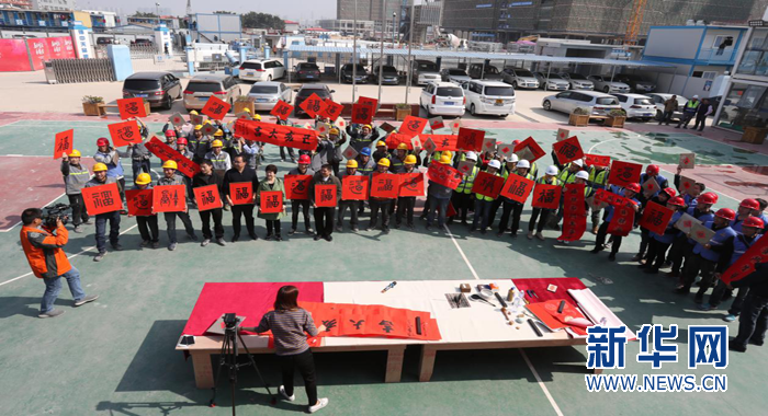 王躍慶為建設者們現場寫“福”字。新華網發