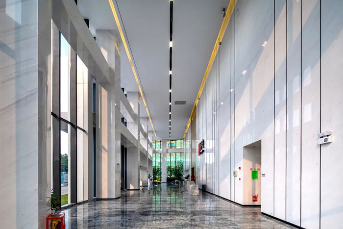 大堂作為企業(yè)最重要也是給客戶第一印象的空間,更應(yīng)該是具有強(qiáng)烈的企業(yè)獨(dú)特性。宏電大廈在大堂的設(shè)計(jì)上摒棄了傳統(tǒng)的方式,化繁為簡(jiǎn),采用低碳綠色、高端簡(jiǎn)約的設(shè)計(jì)理念,兼顧設(shè)計(jì)美學(xué)和可持續(xù)綠色的原則,采用超高空間、超大采光的立面裝飾,使大堂全天最大限度的接收自然光線的照射,為空間帶來(lái)純粹的視覺(jué)震撼。立柱和墻面選用白色大氣的環(huán)保石材,與地面平整光滑的深色搭配,一深一淺,勾勒出大廈整體低碳科技的主題色。