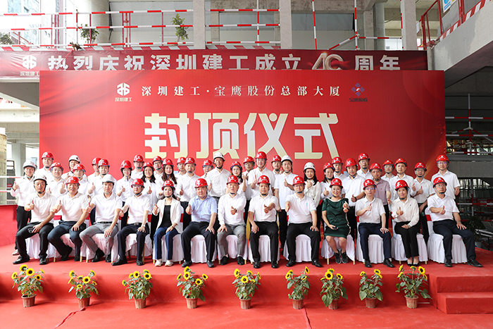 深圳建工控股總裁魏俊,深圳建工控股副總裁、金眾地產集團總裁朱凱,寶鷹股份監事長古少波,深圳建工控股副總裁、深圳建工董事長魏慶國,寶鷹股份副總經理、寶鷹建設董事沈旭艷、深圳建工控股副總裁何素環,深圳建工集團總裁蔡文乳以及特發監理等項目建設相關負責人共同見證項目的全面封頂。